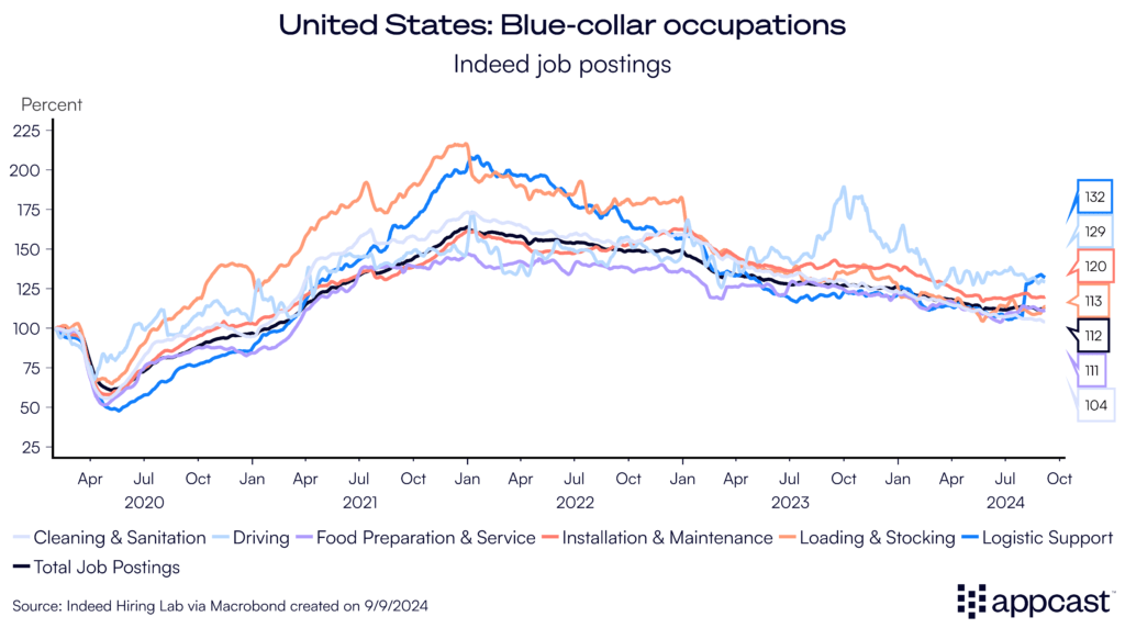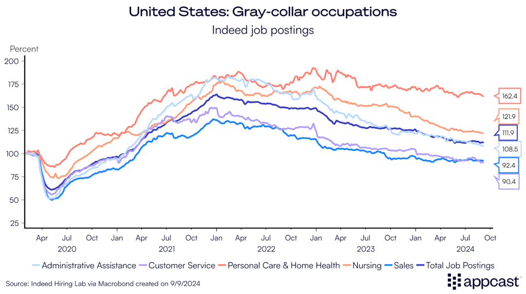 However, the labor market is now experiencing a white-collar recession as job postings have plummeted and some companies have frozen hiring. For blue-collar workers, on the other hand, the labor market remains tighter. The situation for gray-collar jobs is more nuanced: high demand for healthcare related positions, but lower demand for customer service and sales roles.