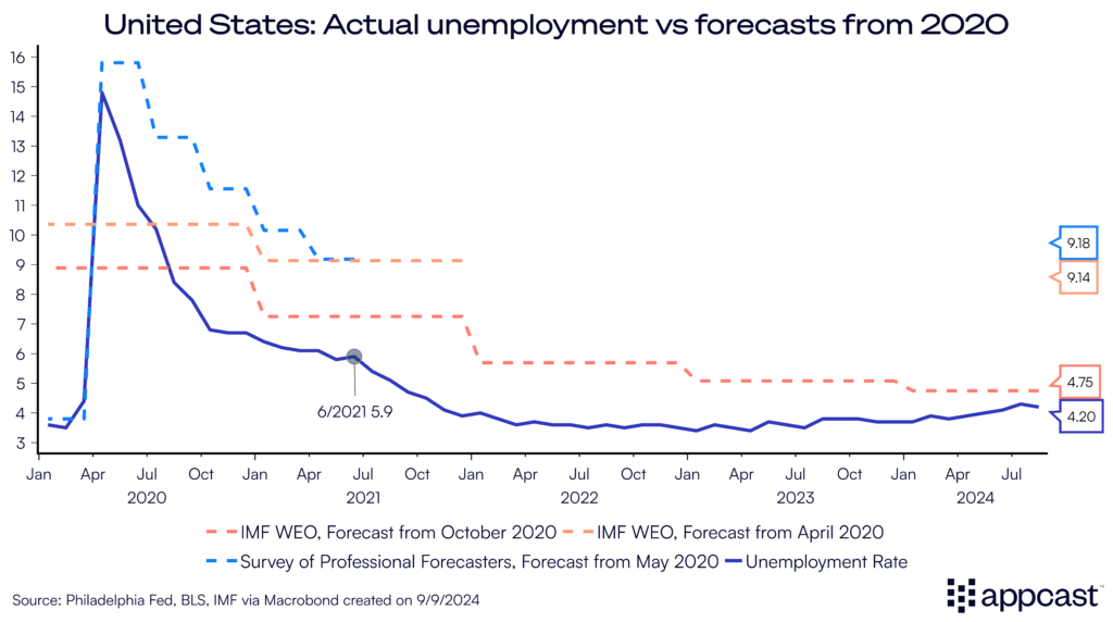 The IMF, for example, projected back in April 2020 that the U.S. unemployment rate would stay at 9% throughout 2021 while the actual unemployment rate was closer to 5% during that year.