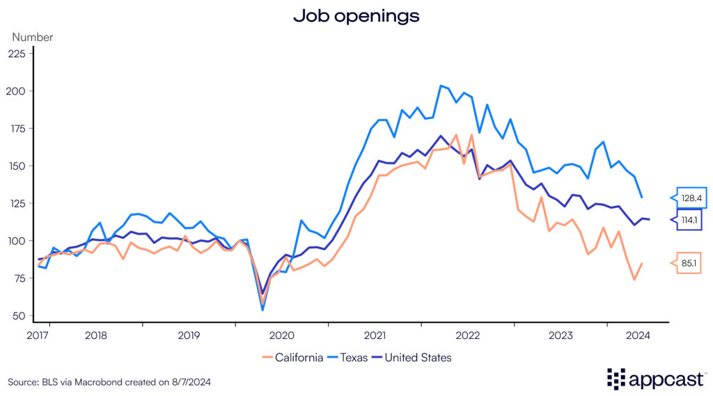 Given the strong local labor market, recruitment remains a challenge. Job openings continue to be highly elevated In Texas. They are some 45% higher than during the pre-pandemic period, a stark contrast to the U.S. as a whole (13% above), or California for that matter (23% below pre-pandemic levels now). Texas’ job market therefore remains tighter than the national labor market.