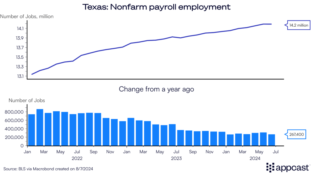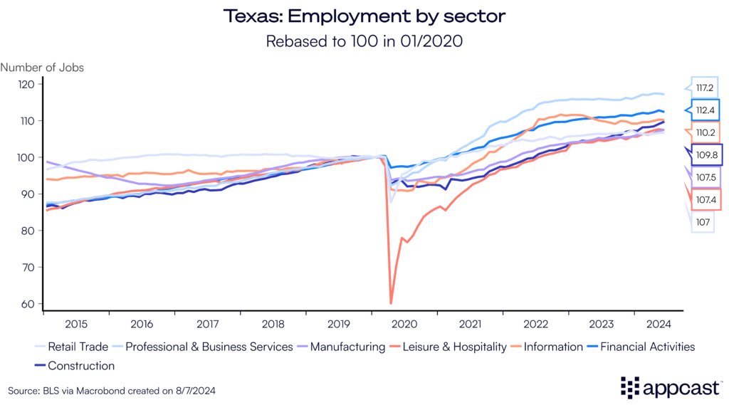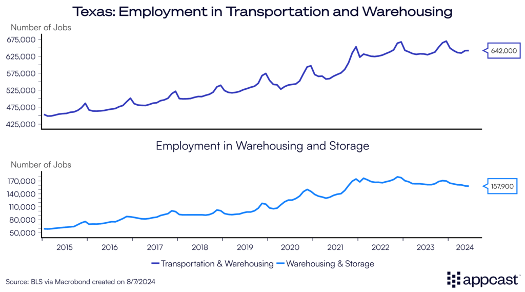 The state’s economy is fueled by several factors, including access to cheap energy sources and the domestic manufacturing boom, which has been favoring the South. Friendshoring to Mexico is also playing a role. It has led to a construction boom and employment surge in the transportation and warehousing sector as global supply chains are being recalibrated due to the geopolitical tensions with China.