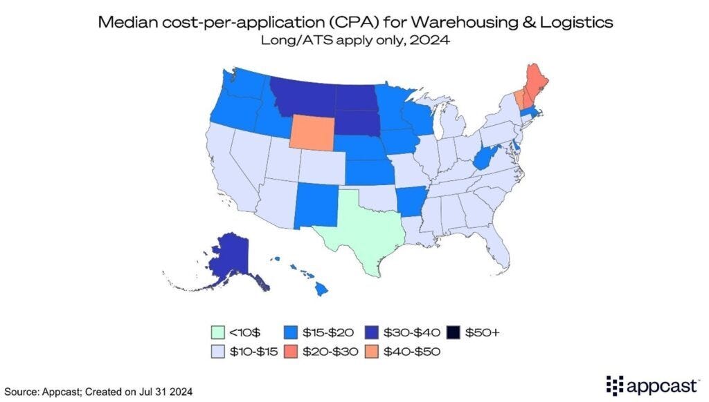 But even as employment in warehousing has risen substantially in the state, Texas remains a low-cost recruitment geography. CPAs in warehousing and logistics are among the very lowest in the nation!
