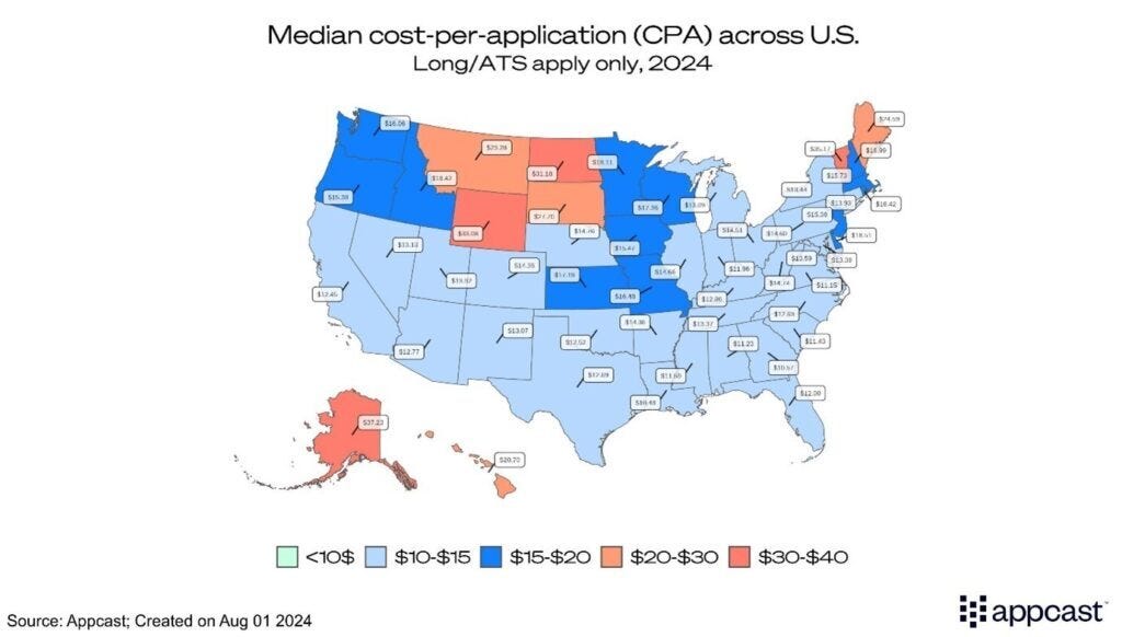 However, even as vacancies remain elevated in Texas, the cost-per-application (CPAs) is reasonably low. The median CPA across sectors stands at around 13 USD, which is slightly below the national average. Texas is therefore currently one of the lower-cost geographies for recruiters even though vacancies remain elevated compared to the nation as a whole. We know from our own data that apply rates in Texas are above average, driving down CPAs. The massive surge in net migration into the state is creating additional labor supply that is contributing to the easing of CPAs over time. The weakening national labor market is also an important factor.