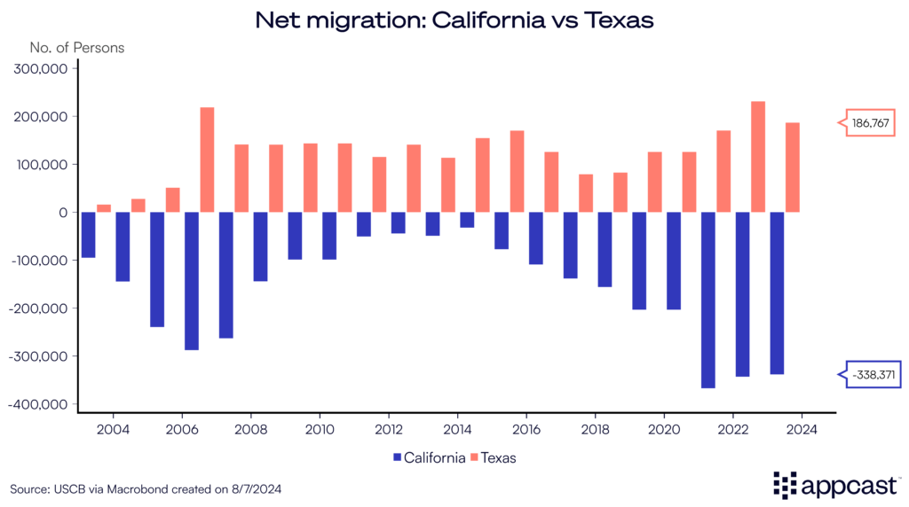 While Texas has added some 200,000 people on net in recent years – and more if you add illegal migrants – California has had a negative migration balance for almost two decades now.
