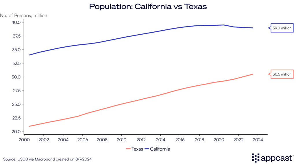 Texas’ population has increased by about 10 million since 2000 and now exceeds 30 million. This rapid growth contrasts sharply with that of California, which has only added five million people since then despite having a higher population.