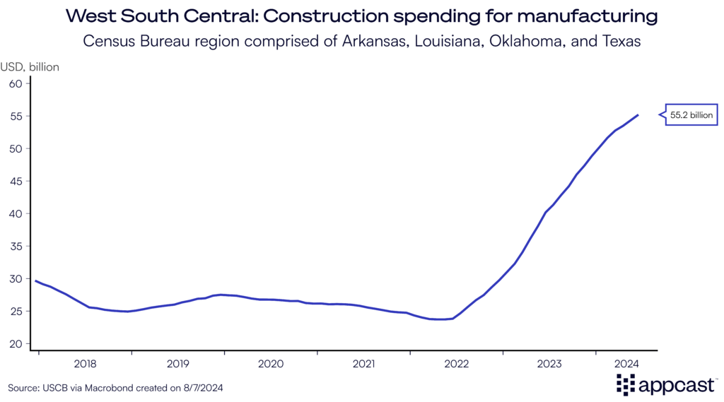 Data from the U.S. Census Bureau shows how construction spending for manufacturing plants has surged nationwide, especially in the Southern part of the U.S., with Texas seeing a good chunk of the boom.